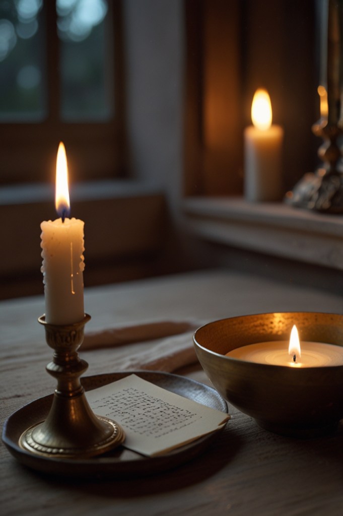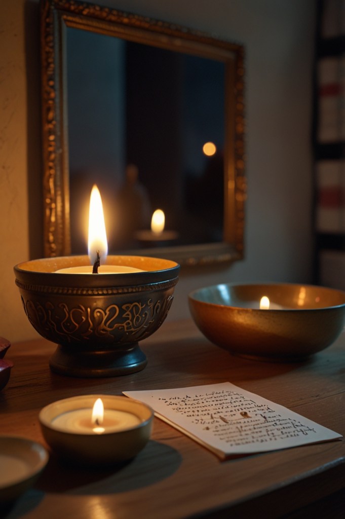 Num espaço silencioso, acenda uma vela branca e uma vela amarela. Sente-se diante de um espelho e escreva: