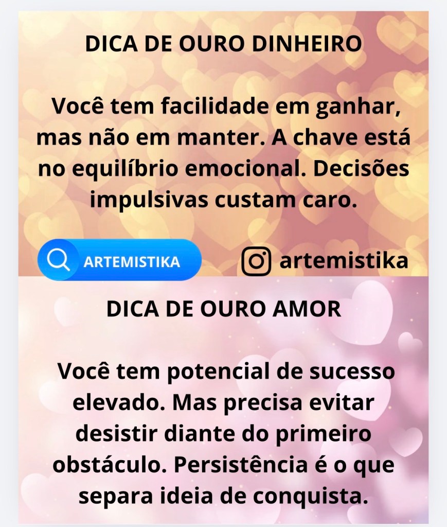 Você tem potencial de sucesso elevado. Mas precisa evitar desistir diante do primeiro obstáculo. Persistência é o que separa ideia de conquista.