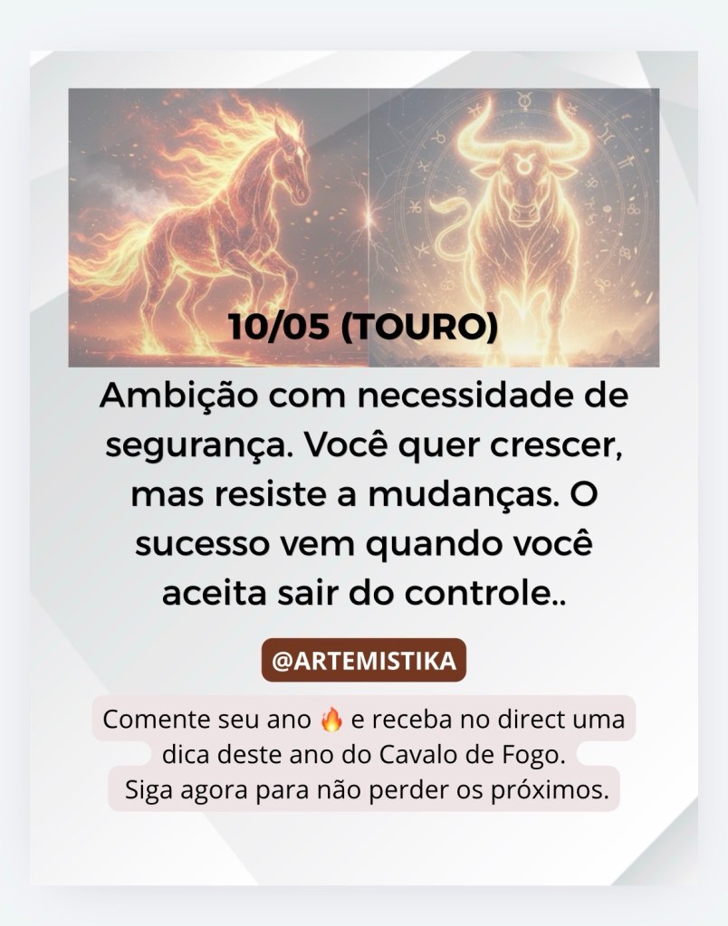Ambição com necessidade de segurança. Você quer crescer, mas resiste a mudanças. O sucesso vem quando você aceita sair do controle.