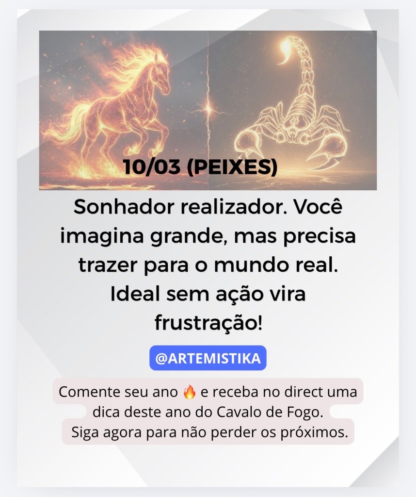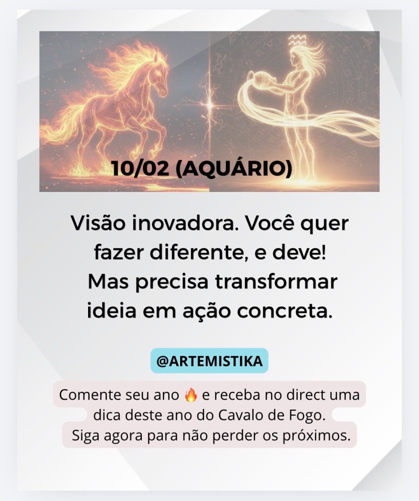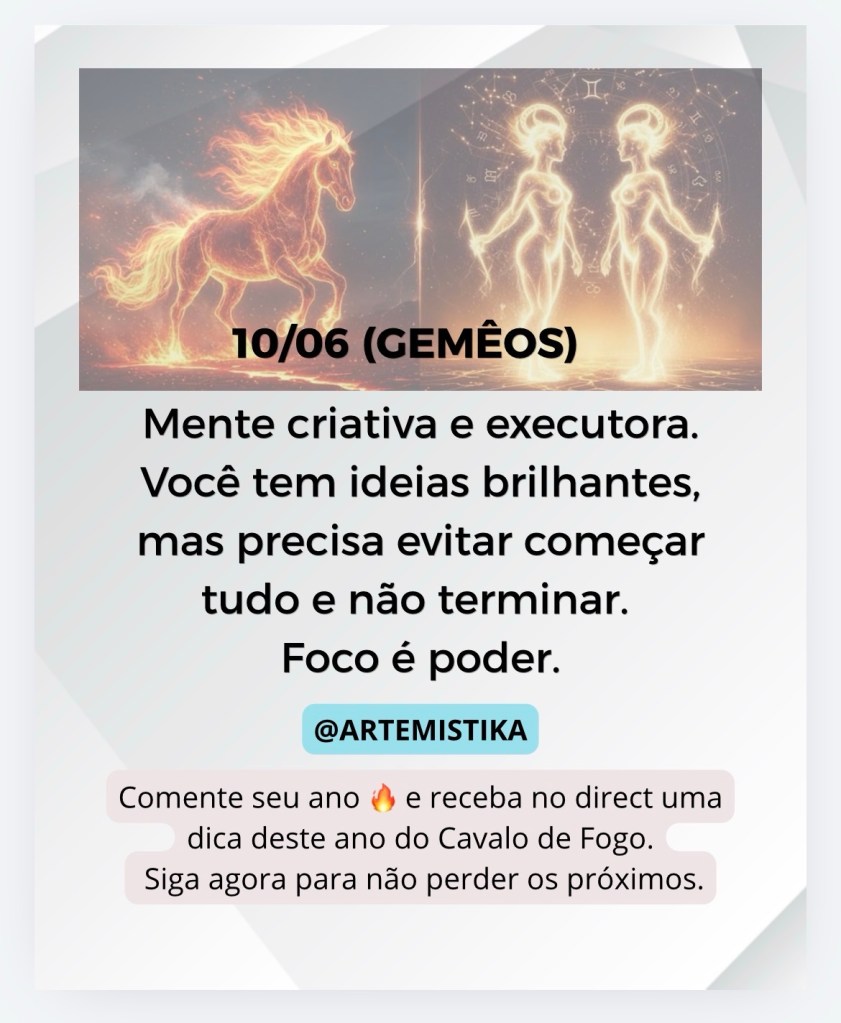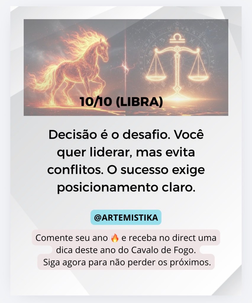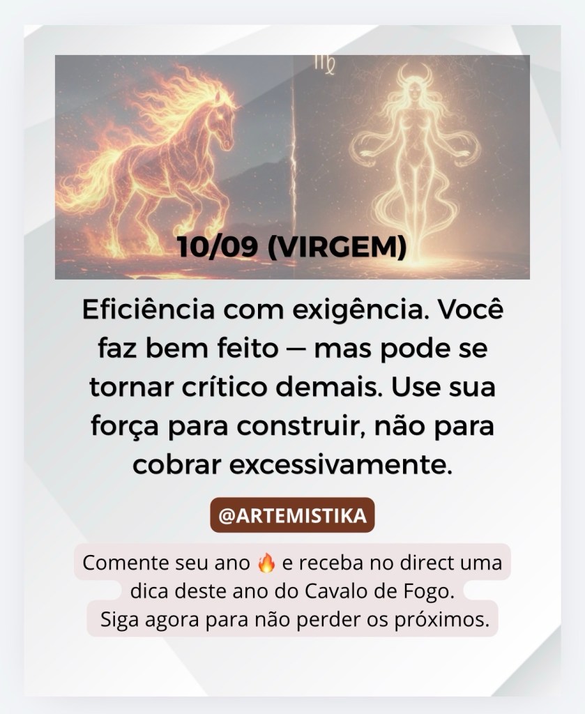 Eficiência com exigência. Você faz bem feito — mas pode se tornar crítico demais. Use sua força para construir, não para cobrar excessivamente.