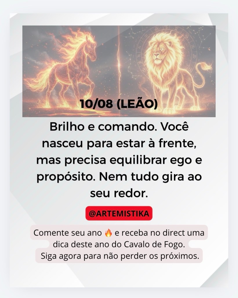 Brilho e comando. Você nasceu para estar à frente, mas precisa equilibrar ego e propósito. Nem tudo gira ao seu redor.